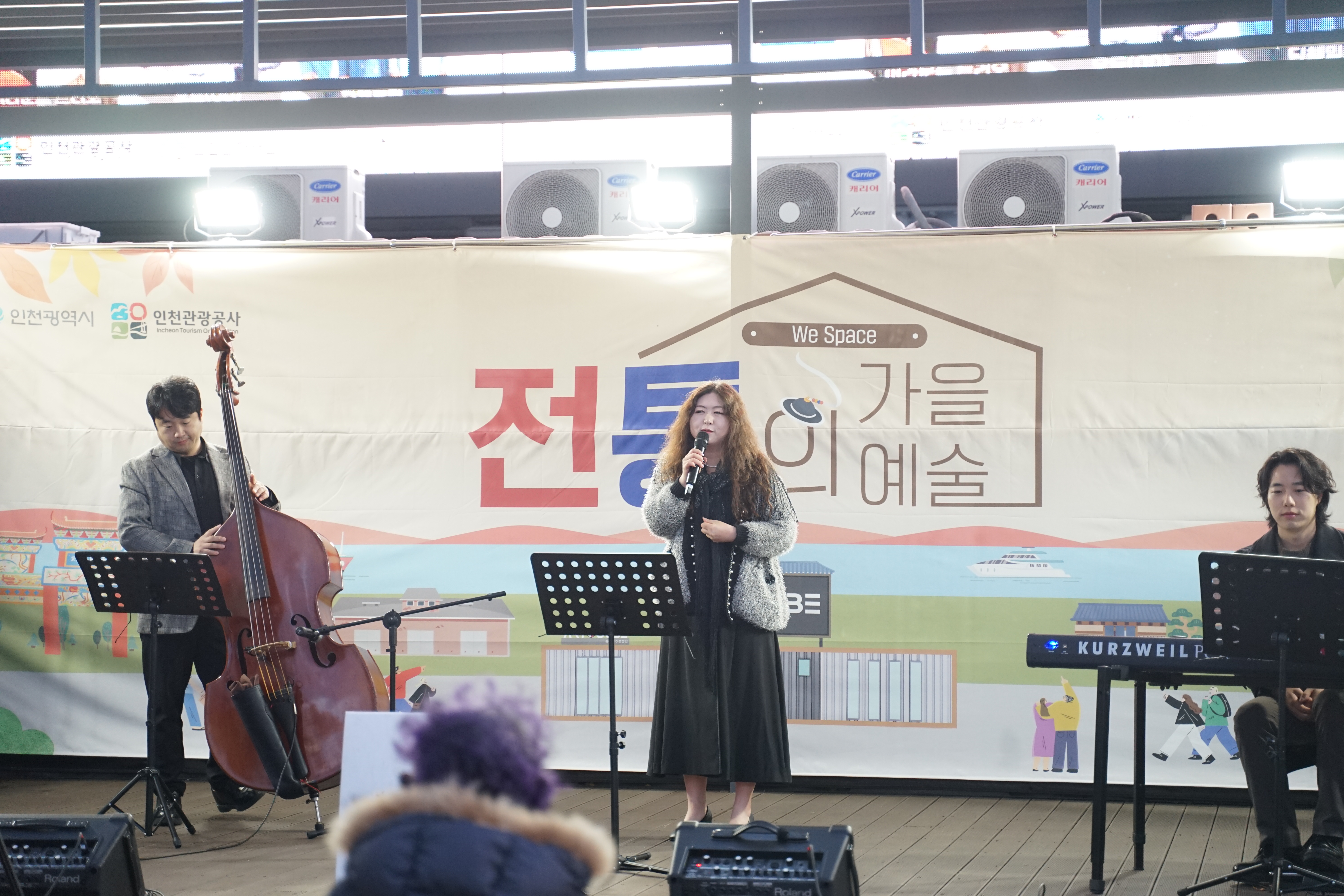 첫 번째로 공연을 진행한 ‘어라운드 트리오’는 재즈를 기반으로 공연을 진행하는 팀입니다. 주로 인천에서 활동을 하고 있고 콘트라베이스, 건반, 보컬과 함께 재즈의 우아한 리듬을 선보입니다. 버스킹에서는 보기 힘든 콘트라베이스를 직접 챙겨 오셔서 연주하는 모습이 가장 인상적이었습니다.