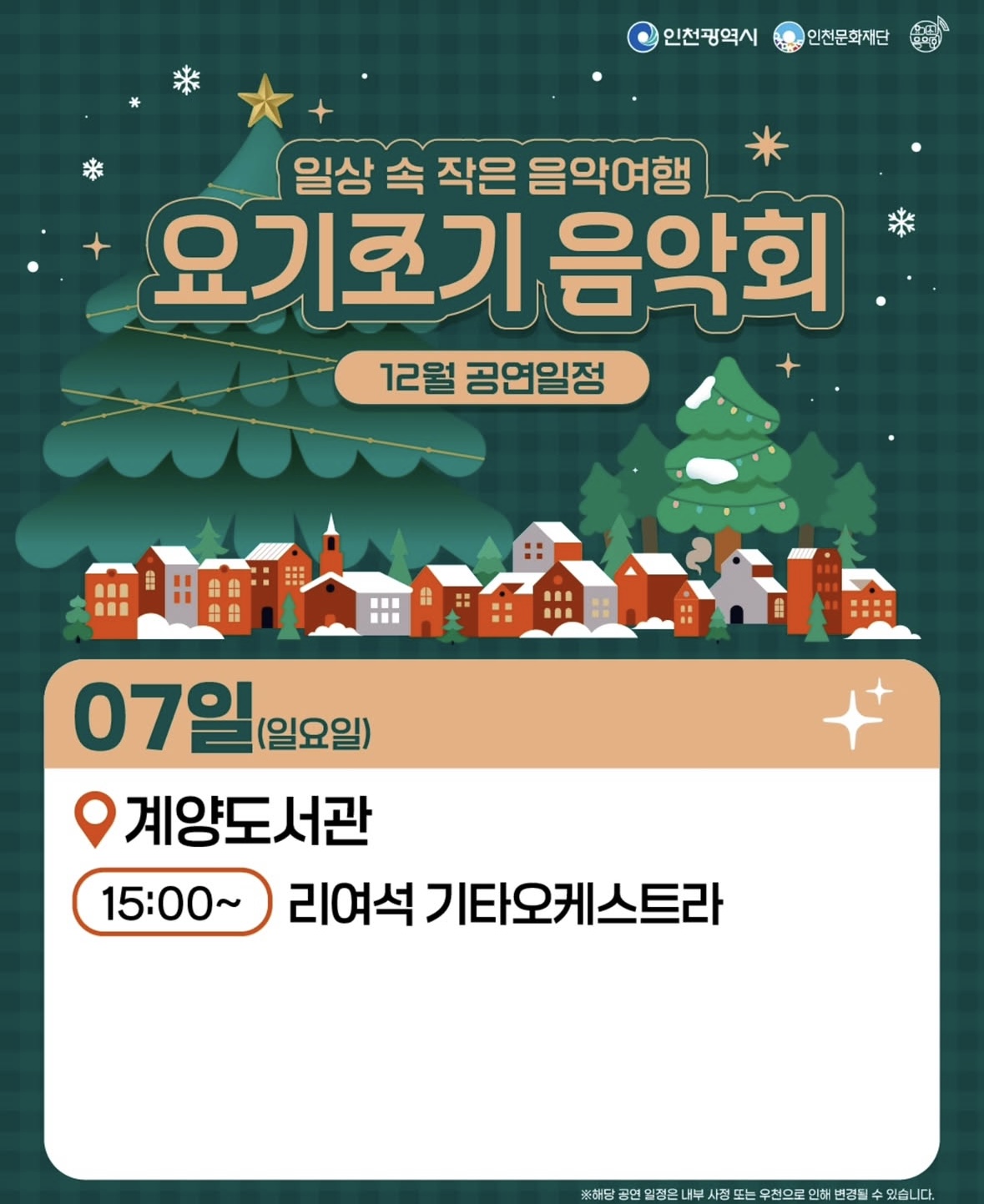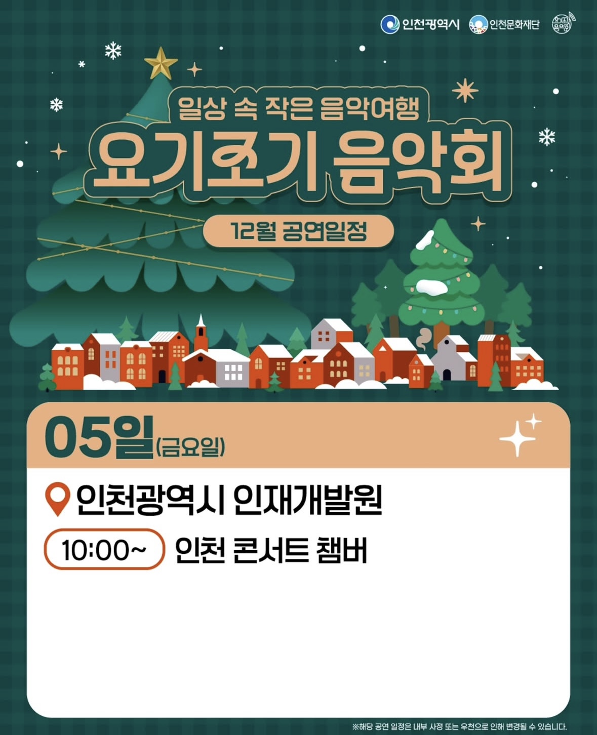 이렇게 다양한 매력을 지닌 아티스트분들의 공연이 12월까지 무료로 인천 지역 곳곳에서 진행됩니다.